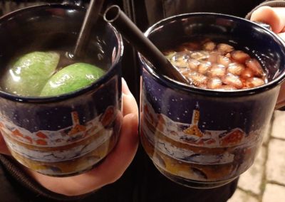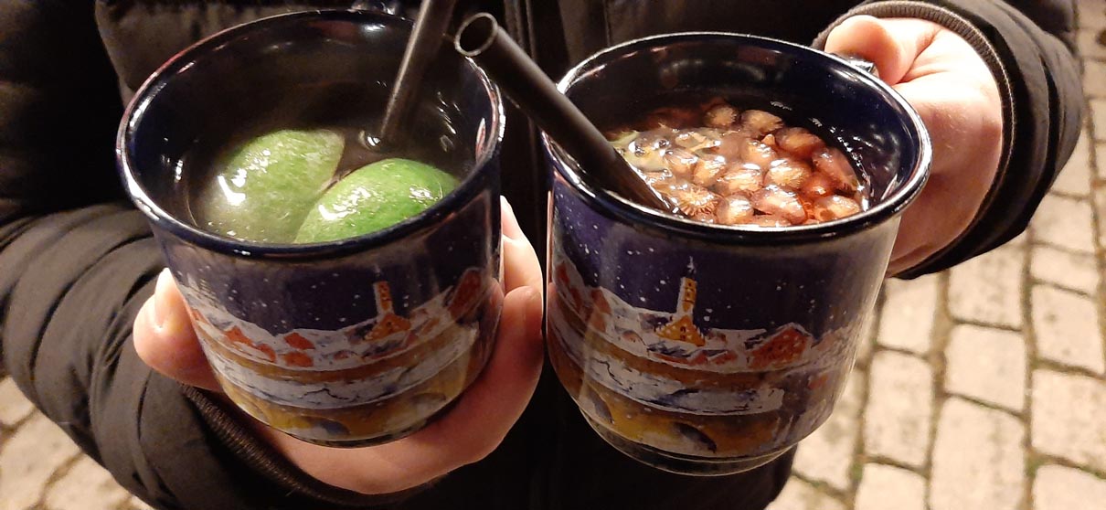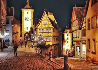 Der Weihnachtsmarkt verteilt sich sehr schön durch die Rothenburger Gässchen und bietet neben dem traditionellen Angebot von Bratwurst und Glühwein auch Schmankerl wie Schäuferle mit Kraut im Brötchen oder Granatapfel-Punsch.