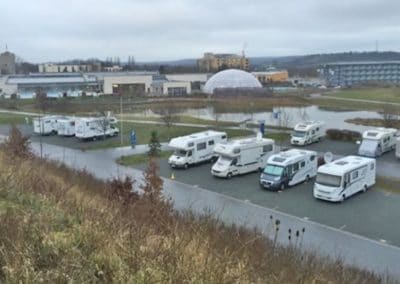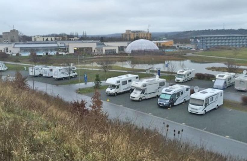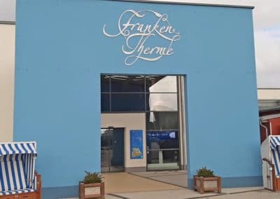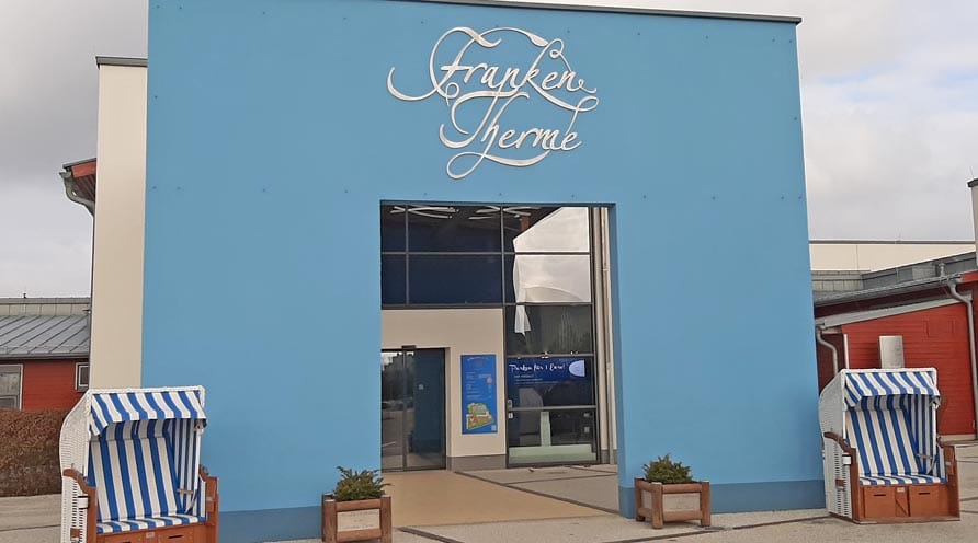 Nach einer ruhigen Nacht trotz der angrenzenden Hauptstraße und einem kurzen Einkaufsstopp am naheliegenden Supermarkt geht es für uns weiter ins ca. 30 km entfernte Bad Windsheim. Dort melden wir uns für eine Nacht beim netten Platzwart des Phönix-Reisemobilhafens an. Für 15 Euro stehen wir vis-à-vis direkt zur Franken-Therme. Strom gibt es gegen Geldeinwurf am Platz. Das WC und die Dusche sind neu und sauber. Nach einem ausgiebigen Spaziergang mit Gin und Ivo über Wiesen, Felder und durch den angrenzenden Kurpark, machen es sich unsere beiden Vierbeiner im Wohnmobil gemütlich und wir packen unsere Badetasche für den Thermenbesuch.
