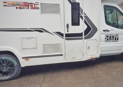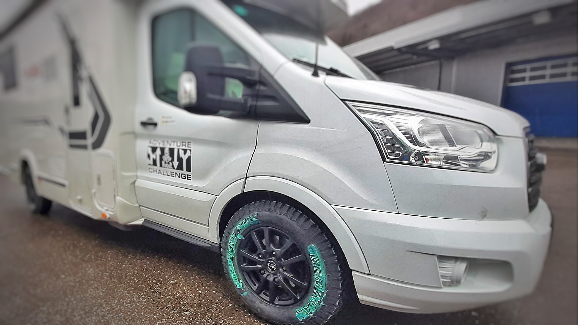 Um etwas mehr Offroad-Tauglichkeit zu schaffen, waren wir schon seit Längerem auf der Suche nach einer All Terrain Bereifung für unser Wohnmobil. Leider ist das für den Ford Transit gar nicht so einfach. In der serienmäßig eingetragenen Reifengröße 235/65 R16C 113P gibt es anscheinend keinen Hersteller, der AT Bereifung anbietet. Erst Herr Gärttling von der Firma ORC Exklusiv, den wir auf der CMT kennenlernten, konnte uns anbieten, die Bereifung auf 225/75 R16C 115S samt 16“ Alufelgen umzurüsten. Wir hatten die Wahl zwischen dem BF Goodrich TA KO 2 oder dem General Grabber AT3. Beide Reifen erfüllen den erforderlichen Lastindex und sind zudem Ganzjahresreifen mit Schneeflockensymbol. Dies war uns wichtig, da wir im Winter nicht auf Winterreifen wechseln wollen. Wir haben uns – auch aufgrund der Empfehlung von Hr. Gärttling – für den General Grabber entschieden, da dieser Reifen etwas bessere Fahreigenschaften auf Asphalt aufweist. General gehört übrigens seit 1987 zur Continental Gruppe.
